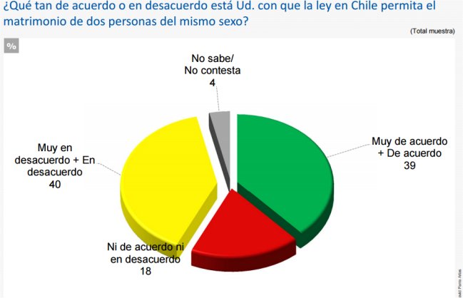 En relación a la pregunta "¿Qué tan de acuerdo o en desacuerdo está Ud. con que la ley en Chile permita el matrimonio de dos personas del mismo sexo?", un 40 por ciento se encuentra en desacuerdo, mientras que un 39 por ciento está de acuerdo.