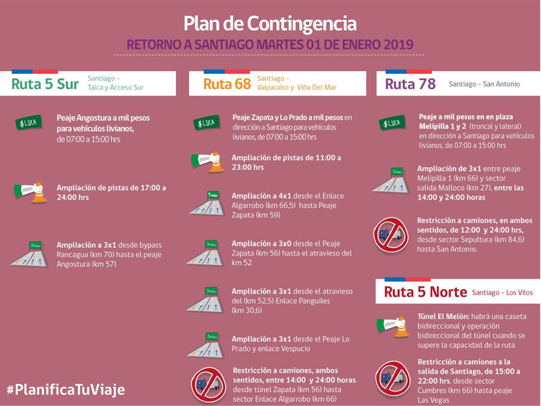 Llegó el 2019 y con ello la primera prueba del año para las distintas carreteras, que ya aplican medidas de contingencia este martes para enfrentar el retorno de los al menos 350 mil vehículos que salieron de Santiago para celebrar las fiestas.
