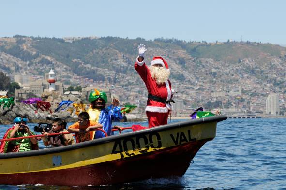 Pescadores de la Caleta Portales celebran, como es tradición la Navidad, paseando junto al Viejo Pascuero por el puerto de Valparaíso en una lancha de pesca artesanal.