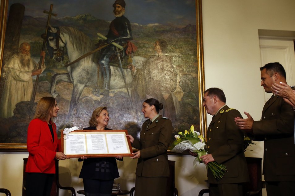 Andrea Neira, teniente de Carabineros, fue reincorporada a la institución tras denunciar que había sido desvinculada durante su fuero maternal en 2015. Este martes en el palacio de La Moneda se realizó la ceremonia oficial en que fue recibida por la Primera Dama Cecilia Morel.