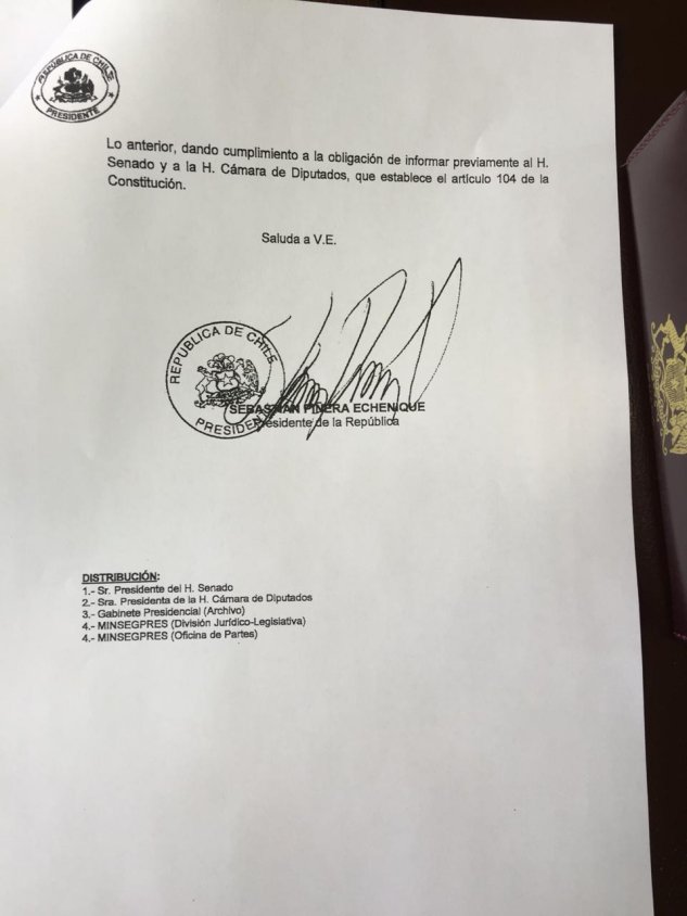 El ministro del Interior, Andrés Chadwick, ya llegó al Congreso para presentar el oficio ante ambas Cámaras, acompañado del subsecretario del Interior, Rodrigo Ubilla. Participará también el ministro de la Secretaría General de la Presidencia, Gonzalo Blumel.