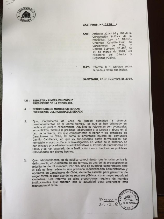 Ya está en el Congreso el oficio presidencial que cumple con la obligación constitucional para el llamado a retiro del aún general director de Carabineros, Hermes Soto, luego que el Presidente Sebastián Piñera le pidiera la renuncia tras los últimos videos conocidos en torno al crimen de Camilo Catrillanca que dieron cuenta de nuevas grabaciones del fatal suceso, ante lo cual el oficial se negó a dejar el cargo.