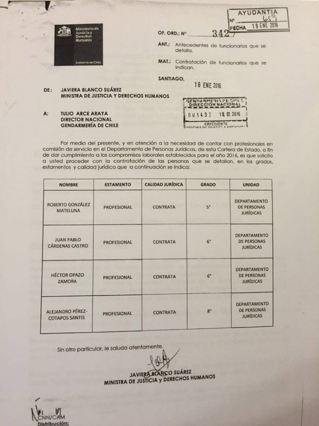 "En necesidad de contar con profesionales en comisión de servicio en el Departamento de Personas Jurídicas, de esta cartera de Estado, a fin de dar cumplimiento a los compromisos laborales establecidos para el año 2016, es que solicito a usted proceder con la contratación de las personas que se detallan, en los grados, estamentos y calidad jurídica que a continuación se indica", se lee en el texto.