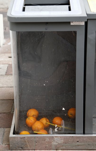 Las naranjas que habían sido colgadas con alambres para rellenar los árboles de uno de los patios de La Moneda tuvieron un triste final: fueron retiradas y botadas a la basura en el mismo palacio de Gobierno.