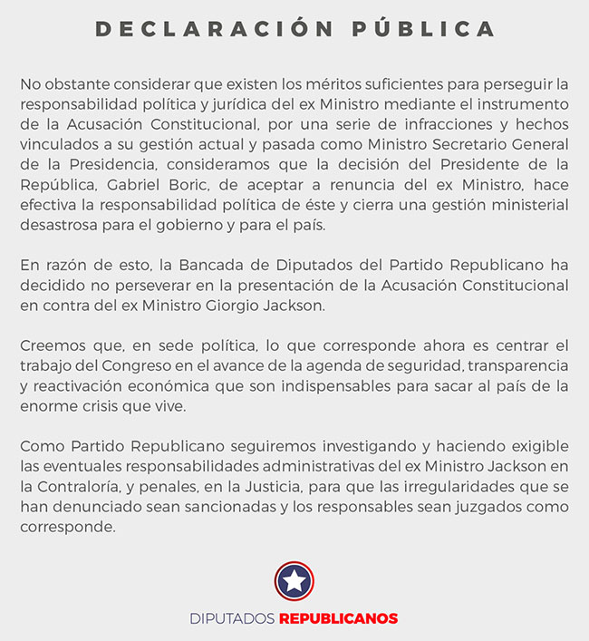 "Como Partido Republicano seguiremos investigando y haciendo exigible las eventuales responsabilidades administrativas del exministro Jackson en la Contraloría, y penales, en la justicia para que las irregularidades que se han denunciado sean sancionadas y los responsables sean juzgados como corresponde", cierra el comunicado.