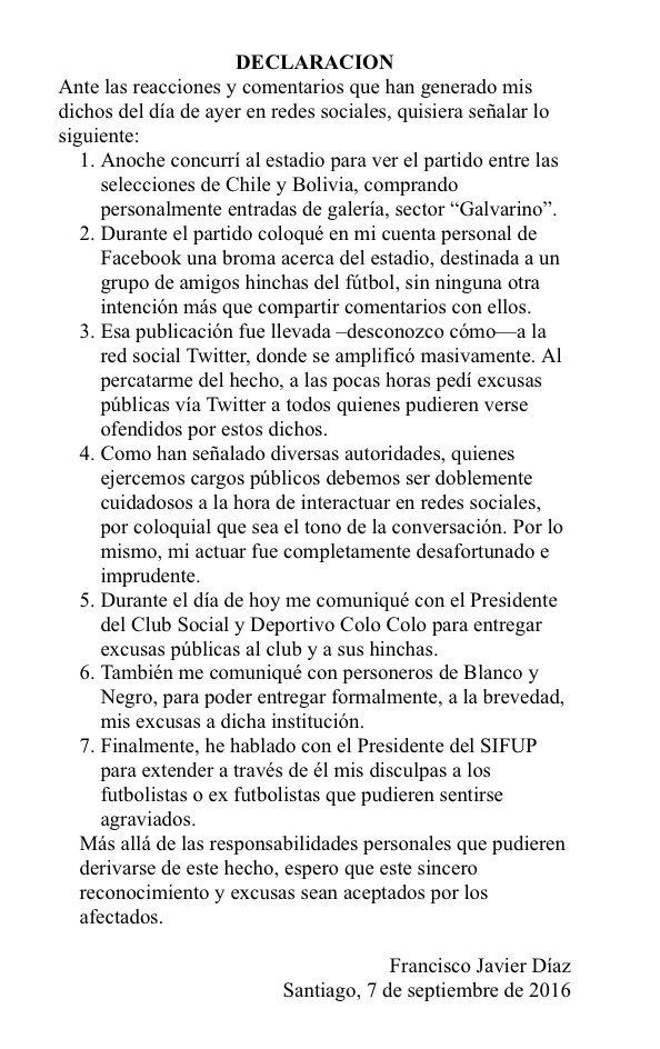 También el subsecretario del Trabajo publicó un comunicado con disculpas a raíz de sus comentarios, los cuales fueron con el objetivo de "compartir comentarios" con amigos hinchas del fútbol.