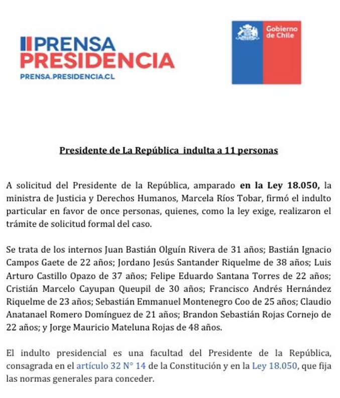 Finalmente, el Ministerio de Justicia y Derechos Humanos emitió un comunicado en el que "informa que, por error, la Unidad de Comunicaciones del ministerio envió de manera incompleta la nómina de personas que fueron indultadas por S.E. el Presidente de la República, mediante la firma de la ministra de Justicia y Derechos Humanos, Marcela Ríos".