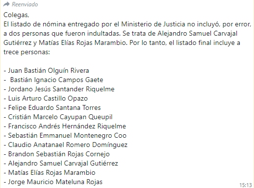 En su primera comunicación a los medios, Prensa de la Presidencia anunció que los indultados eran Juan Bastián Olguín Rivera, Bastián Ignacio Campos Gaete, Jordano Jesús Santander Riquelme, Luis Arturo Castillo Opazo, Felipe Eduardo Santana Torres, Cristián Marcelo Cayupan Queupil, Francisco Andrés Hernández Riquelme, Sebastián Emmanuel Montenegro Coo, Claudio Anatanael Romero Domínguez, Brandon Sebastián Rojas Cornejo y Jorge Mauricio Mateluna Rojas.