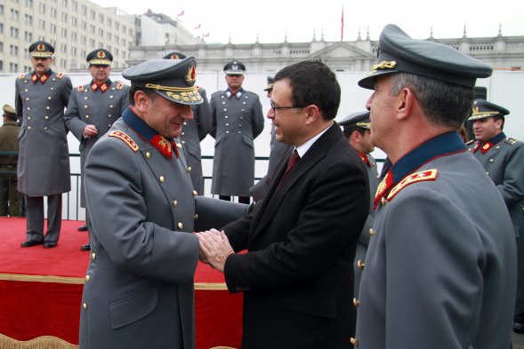 El ministro de Defensa, Rodrigo Hinzpeter, encabezó la ceremonia de izamiento de la bandera nacional ubicada frente al palacio de La Moneda en el inicio del Mes de la Patria y las Glorias del Ejército.