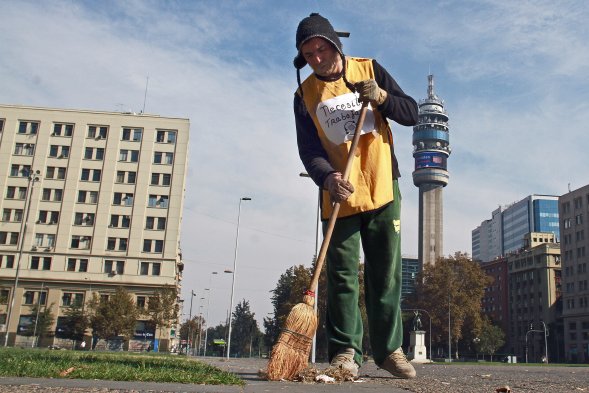 Paralelo a la marcha del Día de los Trabajadores, un hombre quiso protestar de una manera distinta frente a la Moneda. Con un letrero es su pecho que dice "Necesito Trabajar” y una cinta adhesiva en su boca barrió la vereda de la Alameda.
