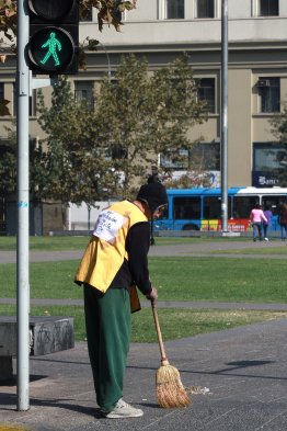 Paralelo a la marcha del Día de los Trabajadores, un hombre quiso protestar de una manera distinta frente a la Moneda. Con un letrero es su pecho que dice "Necesito Trabajar” y una cinta adhesiva en su boca barrió la vereda de la Alameda.