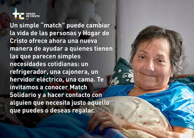 "Match Solidario" es el nombre de una novedosa iniciativa del Hogar de Cristo que busca conectar de manera sencilla y eficiente a adultos mayores con necesidades materiales concretas, y a personas que tienen posibilidad y disposición de ayudarlos.