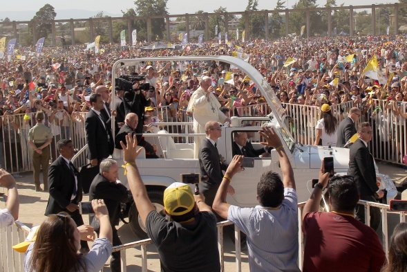 Miles de jóvenes recibieron al papa en su camino al Templo Votivo de Maipú Publicado: Miércoles, 17 de Enero de 2018 3 de 19 El papa llegó al Templo Votivo de Maipú, acompañado de miles de jóvenes que con banderas y pancartas le dieron la bienvenida. El papa llegó al Templo Votivo de Maipú, acompañado de miles de jóvenes que con banderas y pancartas le dieron la bienvenida. ATON