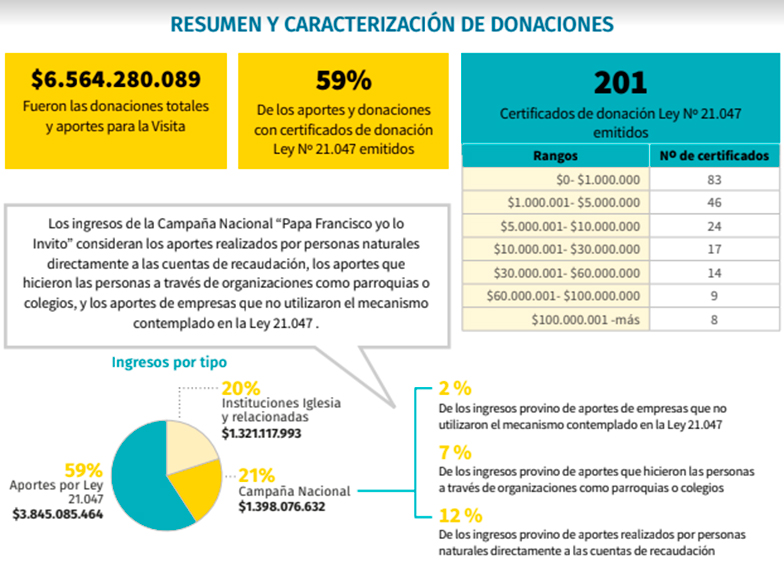 De acuerdo al detalle, el 59 por ciento de los aportes fueron vía Ley de Donaciones, es decir, a través de empresas; 20 por ciento del dinero provino de instituciones de la Iglesia y relacionadas y un 21 por ciento provino de la campaña nacional "Papa Francisco yo lo invito".