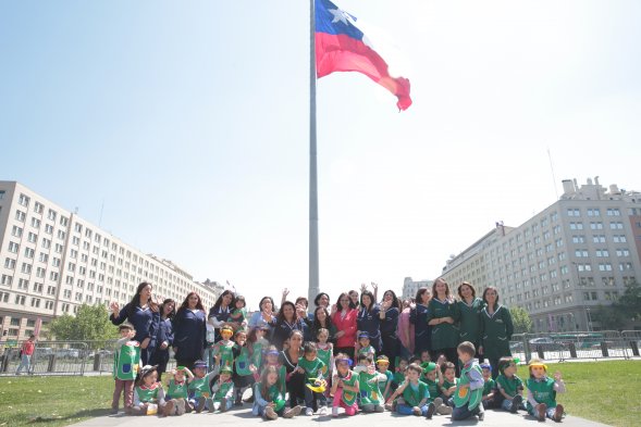 En el marco del 26° aniversario de la Fundación Integra, niños y niñas de los jardines infantiles Amulén de Estación Central y Sol Naciente de Ñuñoa participaron, junto a autoridades del Ejército, del izamiento de la Bandera Bicentenario, frente al Palacio de La Moneda.