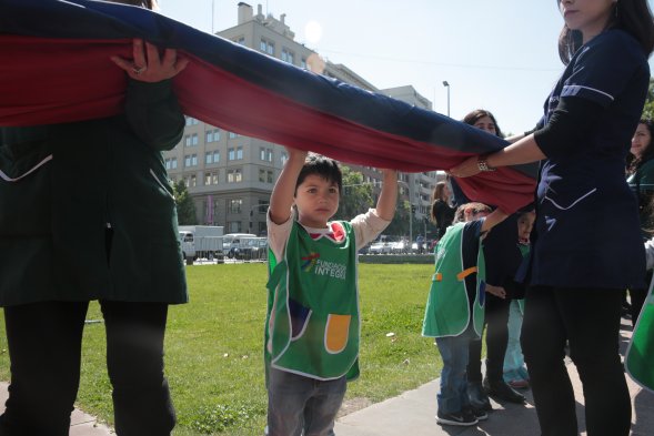 En el marco del 26° aniversario de la Fundación Integra, niños y niñas de los jardines infantiles Amulén de Estación Central y Sol Naciente de Ñuñoa participaron, junto a autoridades del Ejército, del izamiento de la Bandera Bicentenario, frente al Palacio de La Moneda.