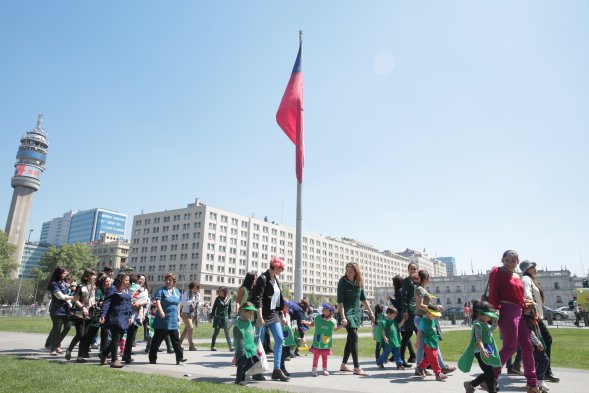 En el marco del 26° aniversario de la Fundación Integra, niños y niñas de los jardines infantiles Amulén de Estación Central y Sol Naciente de Ñuñoa participaron, junto a autoridades del Ejército, del izamiento de la Bandera Bicentenario, frente al Palacio de La Moneda.