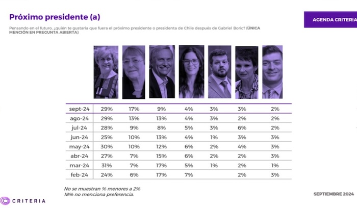 Por su parte, la alcaldesa de Providencia y carta presidencial de Chile Vamos no registró variaciones respecto a la encuesta del mes anterior y continúa liderando la carrera con el 29 por ciento de las preferencias.