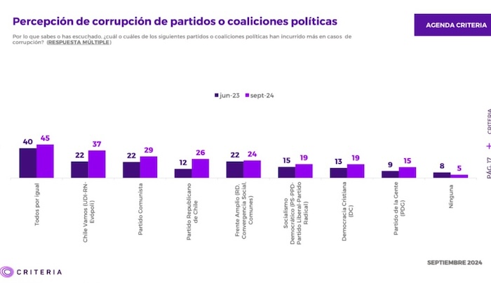 Ante la pregunta:" ¿Cuál o cuáles de los siguientes partidos o coaliciones políticas han incurrido más en casos de corrupción?", la mayor parte de los encuestados respondió que "todos por igual", con un alza de cinco puntos; pero la coalición que agrupa a la UDI, Renovación Nacional y Evópoli anotó un alza de 15 puntos en comparación con junio de 2023, llegando al 37 por ciento.