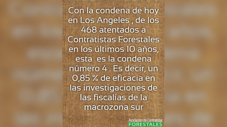 "Es una buena noticia que se logre condenar a este grupo de delincuentes y terroristas que atentaron contra una faena forestal en la comuna de Los Ángeles, pero si nos vamos a las cifras generales, hay (sólo) cuatro atentados de 468 ocurridos durante 10 años en los que hay condena, lo que nos arroja un resultado de un 0,85 por ciento de eficacia de las fiscalías", dijo René Muñoz, gerente de la Asociación.