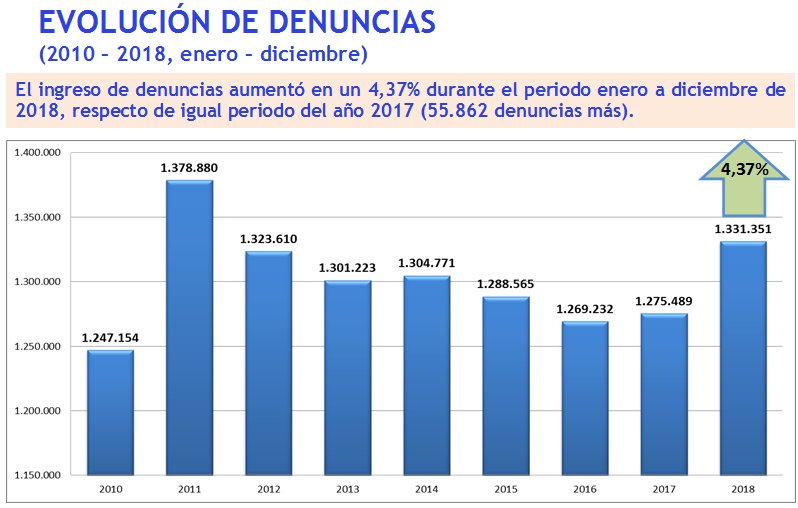 La cifra supone un aumento del 4,37 por ciento en comparación con 2017 (55.862 denuncias más) y, en la comparación, sólo es superada por la estadística de 2011, cuando las denuncias fueron 1.378.880.