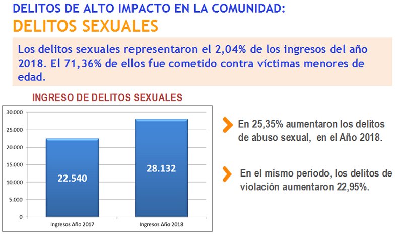 Otra alza revelada fueron las denuncias por delitos sexuales, que tuvieron un aumento respecto al 2017 de 24,81 por ciento –el más alto desde el inicio de la Reforma Procesal Penal- con 28.132 denuncias por abuso sexual y violación, e incrementos de con 25 y 22 por ciento, respectivamente. Del total, un 71 por ciento las víctimas fueron menores de edad.