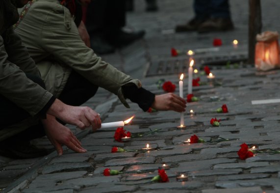 Gente deposita flores en las placas recordatorias de detenidos desaparecidos, en el frontis del ex cuartel de inteligencia ubicado en Calle Londres 38.