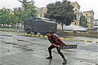 11:35: Secundarios que lograron llegar hasta Plaza Baquedano lanza piedras contra vehículos de Carabineros y generan diversos disturbios.