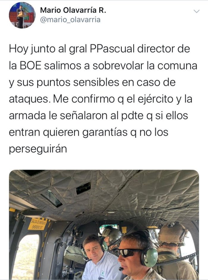 Olavarría publicó un mensaje en Twitter en el que contó que, en un sobrevuelo de su comuna junto al general Pedro Pascual, director de la Brigada de Operaciones Especiales Lautaro del Ejército, éste le ratificó la veracidad de la especulación que rondó esta semana: que el Presidente Piñera consideró la opción de volver a instalar un estado de excepción constitucional, pero las instituciones castrenses le plantearon reparos y exigencias; una versión -esta última- que es negada oficialmente por el Ministerio de Defensa.
