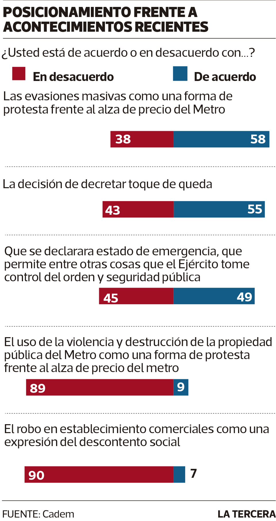 Por otro lado, un 49 por ciento está de acuerdo con la presencia militar en las calles para controlar la situación, mientras que un 45 por ciento rechazó la medida. En tanto, un 55 por ciento favorece que se dictaran toques de queda, y un 43 por ciento estuvo en contra.