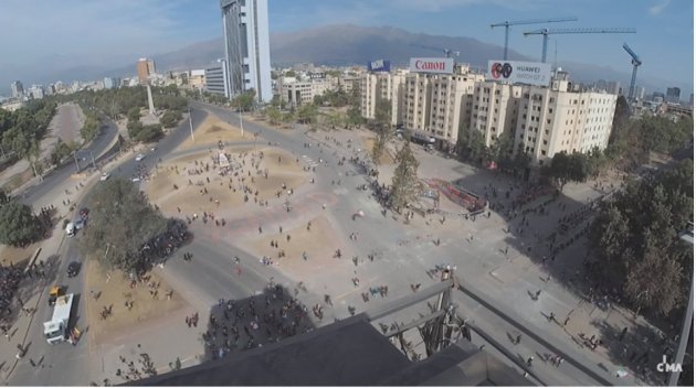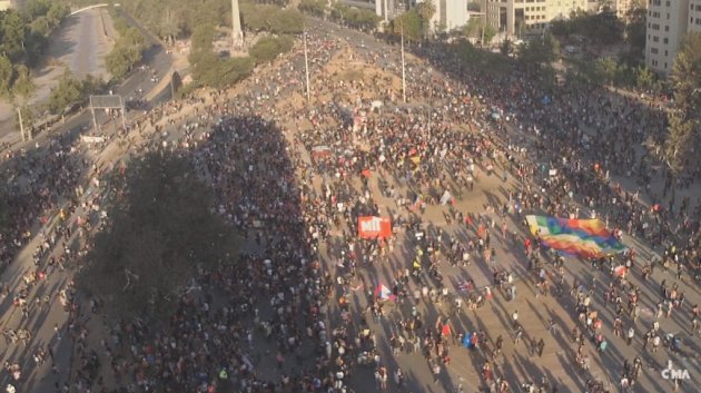 | Carabineros sigue dispersando a los manifestantes que intentan reunirse en el sector de Plaza Italia. En el monumento al General Baquedano se observan banderas del movimiento "No AFP".