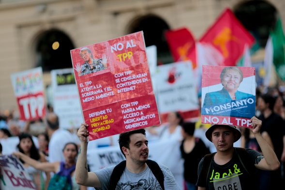 Cientos de personas se manifestaron en la tarde de este viernes en las calles de Santiago manifestando su rechazo a la firma del Acuerdo de Asociación Transpacífico (TPP).