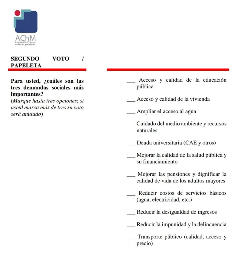 La última pregunta es sobre las demandas sociales de la ciudadanía, donde los participantes deberán seleccionar hasta tres opciones, entre el acceso a la educación pública, la vivienda, cuidado al medio ambiente, transporte público o delincuencia, entre otros.