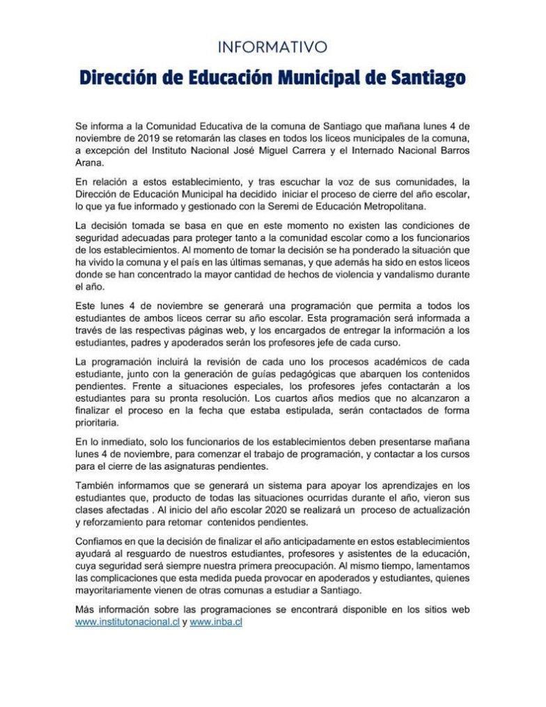 Además la DEM informó que todos los liceos municipales de la comuna de Santiago retomarán sus clases desde mañana lunes 4 de noviembre, a excepción de los dos colegios nombrados anteriormente.