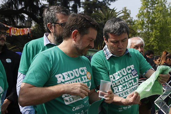 El ministro de Medio Ambiente, Marcelo Mena, y el intendente de la Región Metropolitana, Claudio Orrego, participaron en la "Gran Fiesta del Reciclaje", instancia gratuita que se realiza este lunes en el Parque Quinta Normal y que busca reunir a la ciudadanía en torno a la importancia de reducir, reutilizar y reciclar.