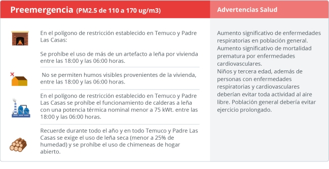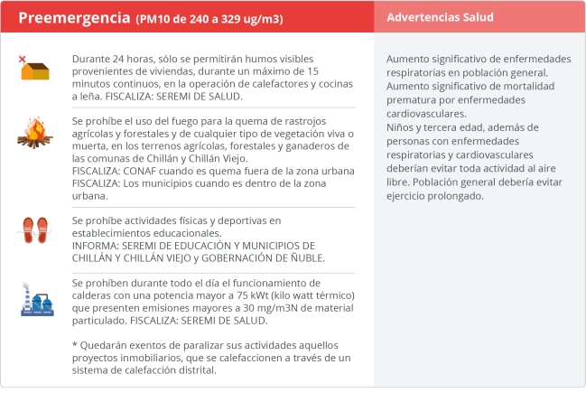 El Ministerio del Medio Ambiente informó que habrá preemergencia ambiental este lunes en las comunas de Chillán y Chillán Viejo (Región del Biobío), Temuco y Padre Las Casas (La Araucanía) y Osorno (Los Lagos).