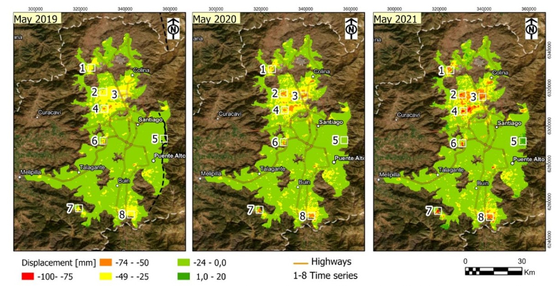 El análisis "Monitoreo de deformación de alta resolución de DInSAR: implicaciones para riesgos geológicos y estabilidad del terreno en el área metropolitana zona de Santiago, Chile" fue realizado por científicos de las universidades La Sapienza (Roma); de Concepción y la U. Católica, mostró que hay áreas que presentan hundimientos anómalos, especialmente al norte y al sur de Santiago.