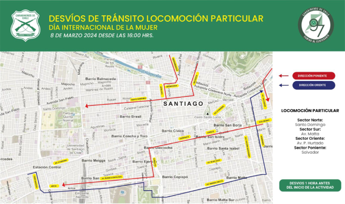 La marcha implicará cortes de tránsito en el centro de Santiago que se aplicarán desde las 16:00 horas, según detalló Carabineros: desde el oriente por Eliodoro Yáñez, hasta la altura de Toro Mazote por el poniente; al norte con Bellavista y al sur con Avenida Matta.