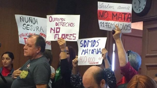 Un grupo de feministas llegó al Concejo Municipal de Ñuñoa para manifestarse contra el concejal UDI, hijo del fallecido comentarista deportivo.