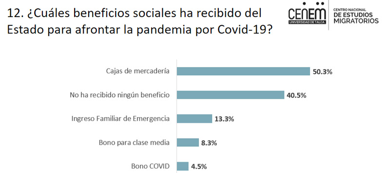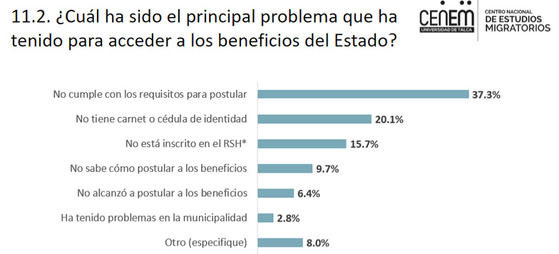 Así lo reveló el estudio "Situación laboral y acceso a beneficios sociales de los inmigrantes", realizado por el Centro Nacional de Estudios Migratorios de la Universidad de Talca (Cenem), en colaboración con el Instituto Católico Chileno de Migración (Incami), que apuntó como principales dificultades: restricciones de los beneficios, falta de cédula de identidad, no estar inscrito en el Registro Social de Hogares o simplemente no saber cómo postular a los beneficios.
