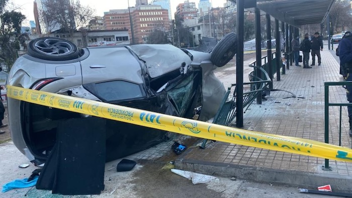 Otro accidente de tránsito se registró durante esta madrugada en la esquina de Tobalaba con Avenida Vitacura, en la comuna de Providencia, donde un conductor colisionó con un paradero de locomoción colectiva y terminó volcando su vehículo.