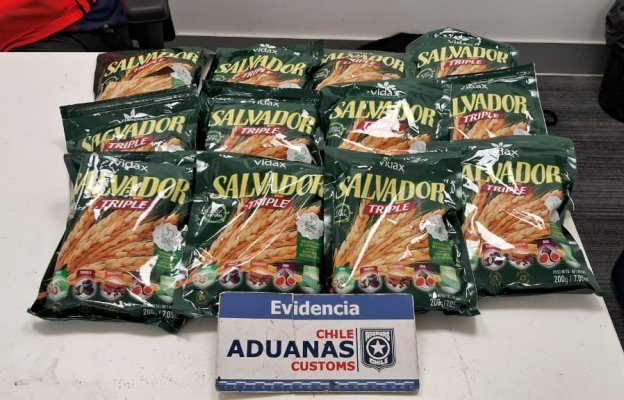 "Las alertas se levantaron en la revisión con equipos de rayos x del equipaje del pasajero que realiza el Servicio Agrícola y Ganadero (SAG) y Aduanas. Allí los funcionarios detectaron anomalías en el equipaje del viajero y, luego en la revisión física del equipaje, se determinó que además de ropa portaba bolsas de lo que a simple vista parecía salvado de trigo", detalló Aduanas.