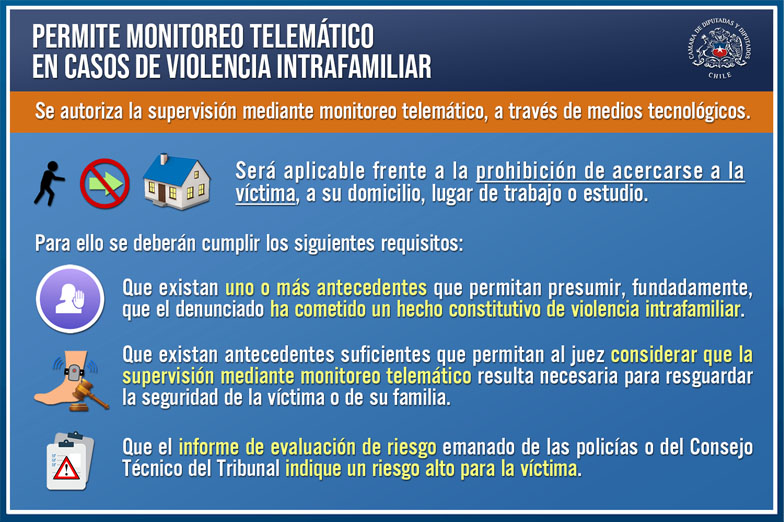 En concreto, crea un nuevo marco legal que autoriza la supervisión mediante monitoreo telemático, a través de medios tecnológicos: se podrá aplicar frente a la prohibición de acercarse a la víctima, a su domicilio, lugar de trabajo o estudio, lo cual se implementará conforme a las normas de la Ley de violencia intrafamiliar y de los Tribunales de Familia.