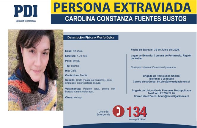 Con bastante reserva se desarrollaron este viernes las diligencias de búsqueda de Carolina Fuentes Bustos, la mujer que permanece desaparecida desde el pasado 30 de junio en su natal comuna de Ninhue, hasta donde había viajado desde Santiago para reunirse con familiares y realizar la venta de una camioneta.