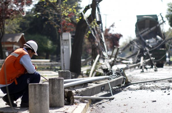 Este martes, un camión que transitaba por la calle Chesterton con Apoquindo, en Las Condes, provocó la caída de varios poste de luz, tras la activación de su tolva, provocando un corte del suministro en el lugar.