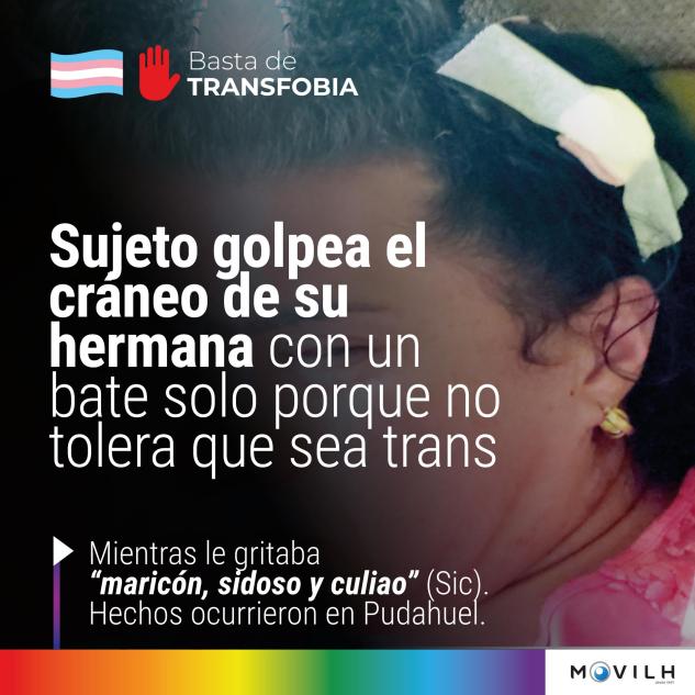 El Movimiento de Integración y Liberación Homosexual (Movilh) anunció acciones legales contra el sujeto que agredió con un bate metálico a su hermana, por ser transexual, y quien resultó con una herida contusa en el cráneo, según se constató en el SAR Pudahuel Estrella.