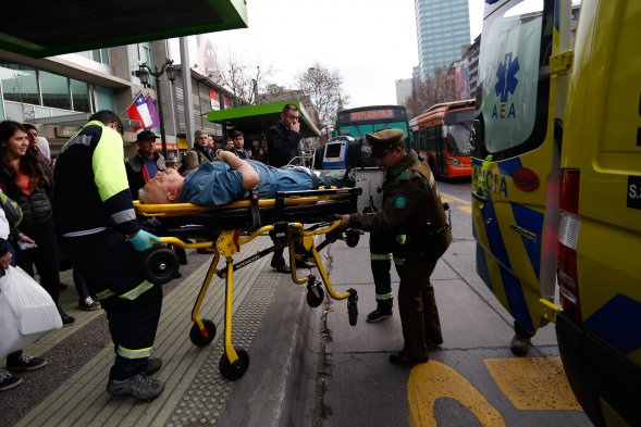 Un grupo de cuatro sujetos protagonizó un violento asalto en una sucursal de BancoEstado ubicada en inmediaciones de la estación de Metro Santa Lucía, donde un guardia resultó herido tras recibir dos impactos de bala.