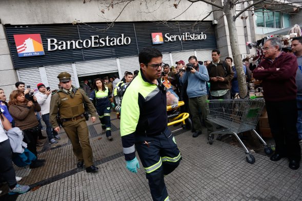Un grupo de cuatro sujetos protagonizó un violento asalto en una sucursal de BancoEstado ubicada en inmediaciones de la estación de Metro Santa Lucía, donde un guardia resultó herido tras recibir dos impactos de bala.