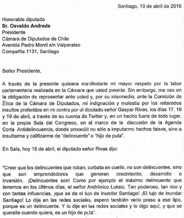 "Honorable diputado Sr. Osvaldo Andrade, (...) Me veo en la obligación de representar ante usted y, por su intermedio, ante la Comisión de Ética de la Cámara de Diputados, mi indignación y molestia por los reiterados insultos proferidos en mi contra por el diputado Gaspar Rivas", escribió Luksic en la carta que difunde El Mostrador.