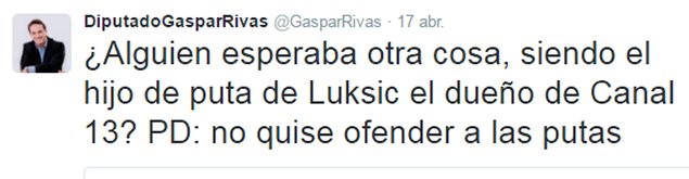 Primero lo hizo el domingo 17 de abril, cuando en su cuenta de Twitter escribió "¿Alguien esperaba otra cosa, siendo el hijo de puta de Luksic el dueño de Canal 13? PD: no quise ofender a las putas".